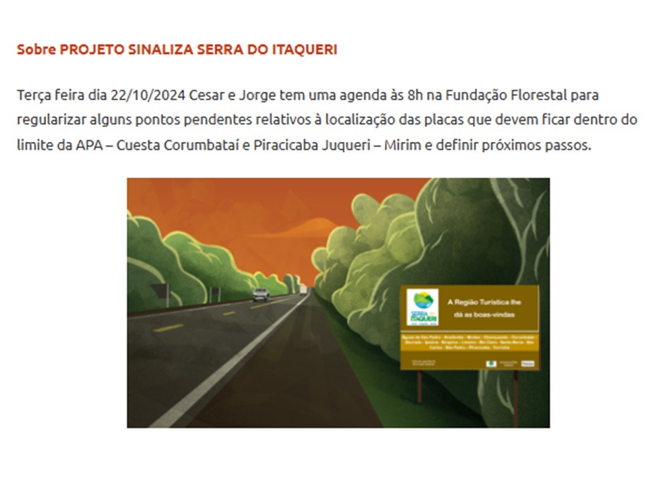 Camila aproveitou o tema da regulamentação para informar que a secretaria de estado foi procurada pelo município de Iracemápolis demonstrando interesse em participar da RT Serra do Itaqueri. Foi definido que o município será informado sobre requisitos anteriormente definidos pela governança para pleitear a participação. São eles: Ter limite geográfico com algum dos municípios da RT, COMTUR tem que estar organizado e apresentar as últimas 5 atas, Tem que ter Plano Diretor de Turismo e Pesquisa de Demanda, apresentar uma carta de intenção de ingresso na RT, participar dos projetos da Serra, participar das reuniões de Grupo Gestor e Governança, ter pasta de turismo, receber visita técnica, não faltar a mais de 3 reuniões injustificadamente.