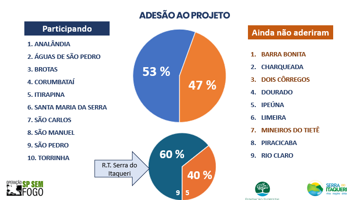 Na sequência, Jorge Duarte, coordenador do grupo de Prevenção e Combate a Incêndios Florestais, apresentou o status do projeto. Ele fez uma síntese dos objetivos e explicou que a primeira etapa consiste no levantamento de informações sobre os recursos materiais e humanos disponíveis em cada município. Destacou que, dos 15 municípios da Serra do Itaqueri, seis ainda não aderiram ao projeto. Por isso, solicitou aos presentes que fornecessem contatos das defesas civis desses municípios para facilitar o contato e a inclusão no processo.