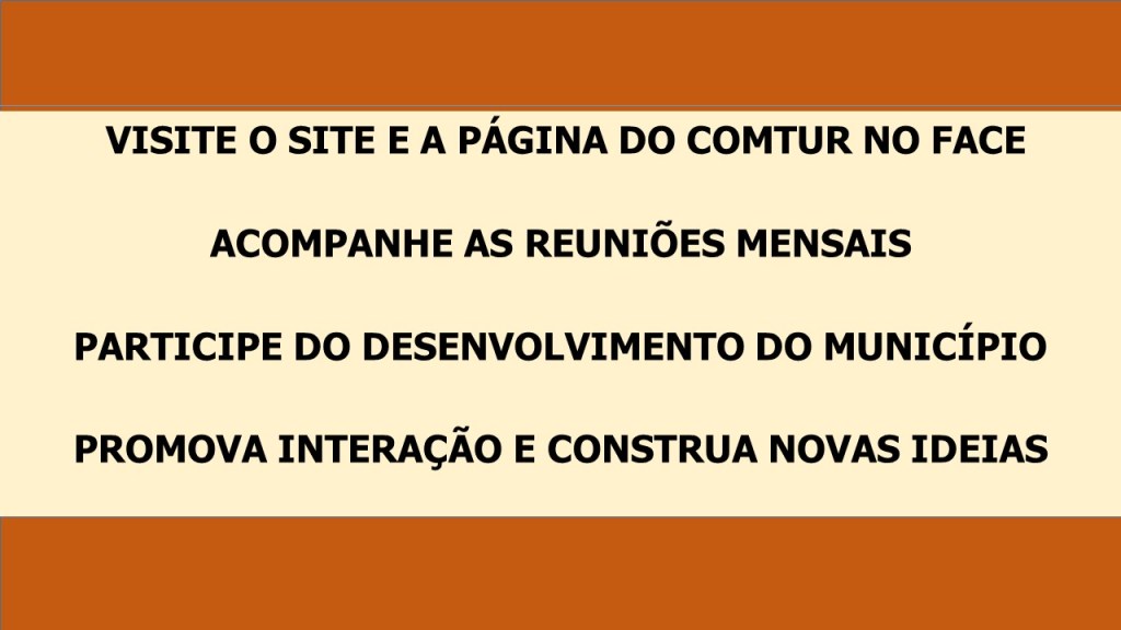 O Plano Diretor Municipal, lei que estabelece as diretrizes da cidade está dando seus primeiros passos a partir de maio de 2022. O COMTUR tinha a proposta de articular e contribuir com essa ação e sugeriu à prefeitura retomar o assunto que prontamente atendeu. O processo de elaboração acontece de outubro 2022 a outubro 2023.