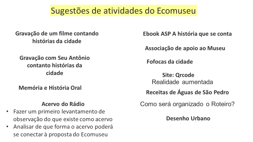 Este é um projeto que requer desenvolvimento de longo prazo. Nos slides projeto Ecomuseu pode-se conferir uma breve ideia do projeto.